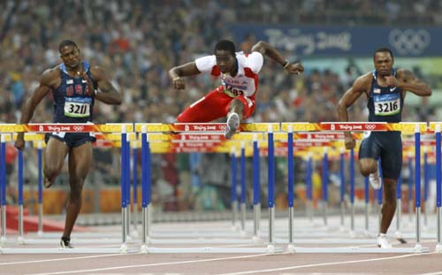 Dayron Robles of Cuba clears a hurdle ahead of David Oliver (L) and David Payne (R) of the U.S. to win their men's 110m hurdles final of the athletics competition in the National Stadium at the Beijing 2008 Olympic Games August 21, 2008. Payne finished second and Oliver third in the event. [Agencies]