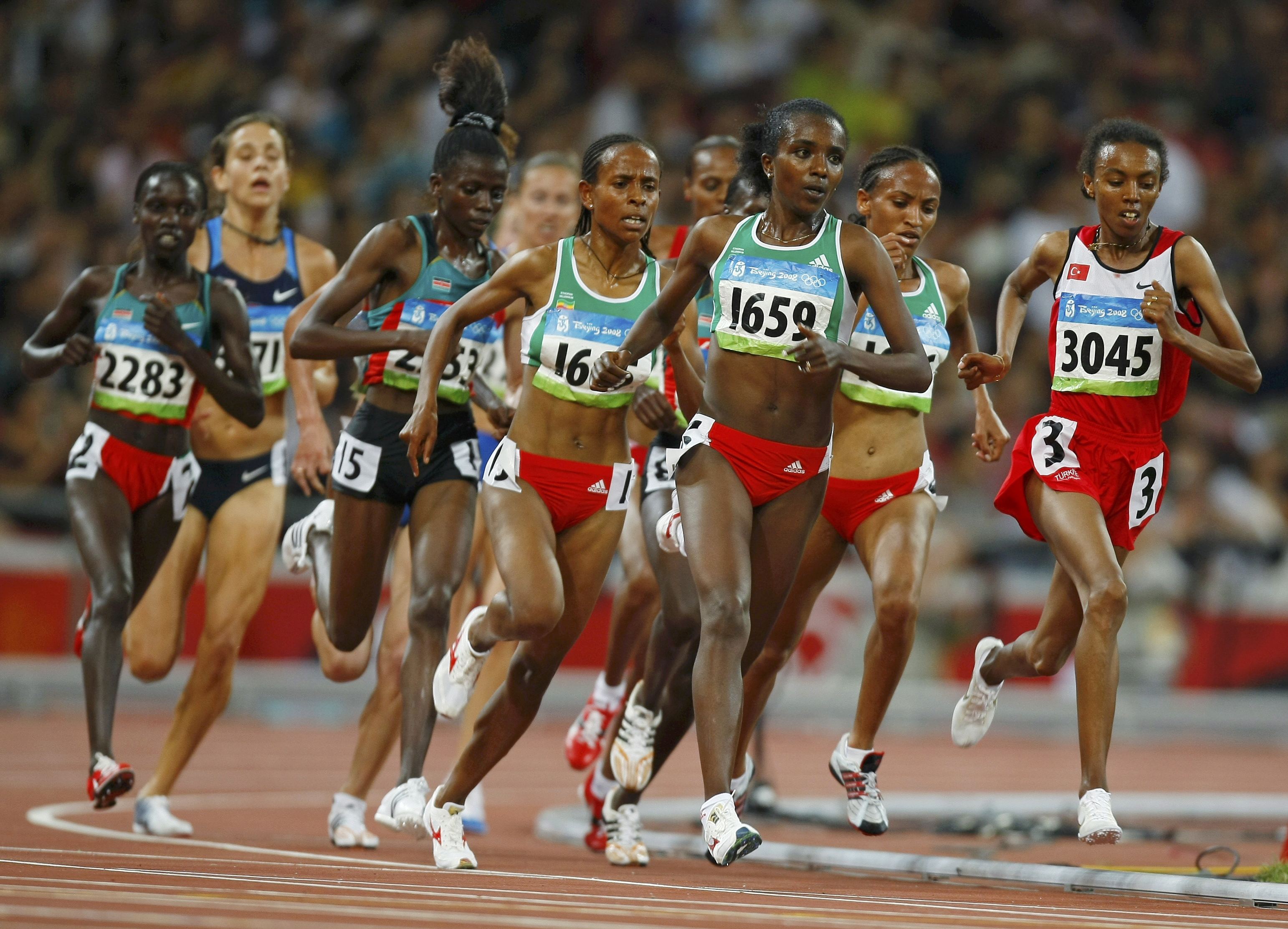 Tirunesh Dibaba of Ethiopia (1659) and Elvan Abeylegesse of Turkey (3045) lead the pack in the women's 5000m final of the athletics competition in the National Stadium at the Beijing 2008 Olympic Games August 22, 2008. [Agencies]