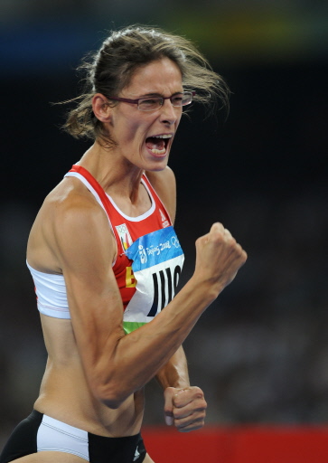 | Belgium's Tia Hellebaut celebrates winning the women's high jump final at the National Stadium as part of the 2008 Beijing Olympic Games on August 23, 2008. [Agencies] |
