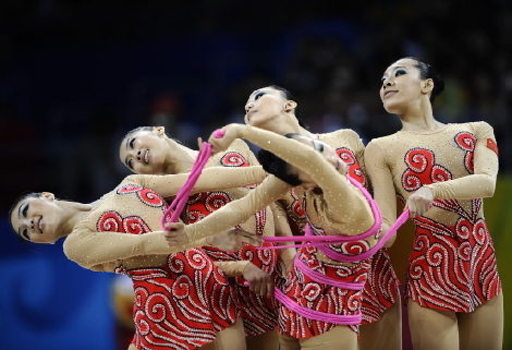 The team of China competes in the group all-around final of the rhythmic gymnastics at the Beijing 2008 Olympic Games in Beijing on August 24, 2008. [Agencies]