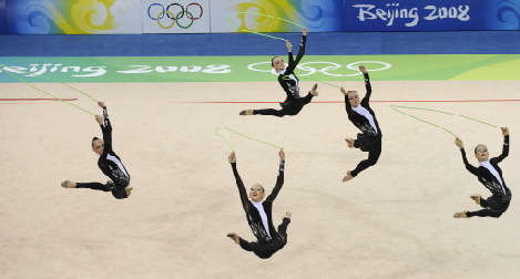 The team of Ukraine competes in the group all-around final of the rhythmic gymnastics at the Beijing 2008 Olympic Games in Beijing on August 24, 2008. [Agencies]
