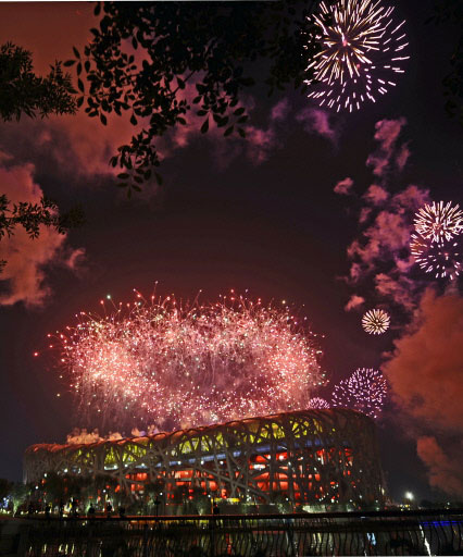 Fireworks light up the sky of the National Stadium, also known as the Bird's Nest, at the start of the closing ceremony of the 2008 Beijing Olympic Games in Beijing on August 24, 2008.[Agencies]