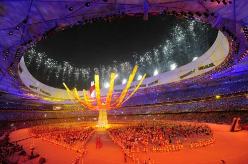 Fireworks light up the sky during the closing ceremony for the 2008 Beijing Olympic Games at the National Stadium also known as the "Bird's Nest" on August 24, 2008. [Agencies]