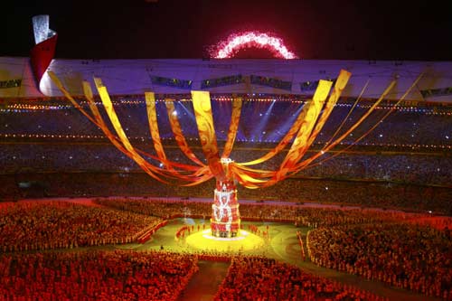 Fireworks explode above participants performing during the closing ceremony of the Beijing 2008 Olympic Games at the National Stadium August 24, 2008. The stadium is also known as the Bird's Nest.[Agencies]