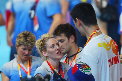 Basketball players Lauren Jackson of Australia and Yao Ming of China speak in the Beijing National Stadium during the Closing Ceremony for the 2008 Beijing Olympics.[Agencies]