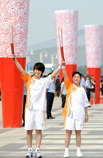 Song Xiaobo(L) poses with Zhao Jihong, a visual impaired model worker. The Paralympic torch relay started its tour in Shanghai on September 1,2008. [Xinhua]