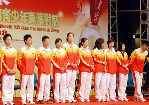 China's Olympic gold medallists talke with an audience gathered in Macao.They received a warm welcome from officials and local residents, September 1, 2008. [Xinhua]