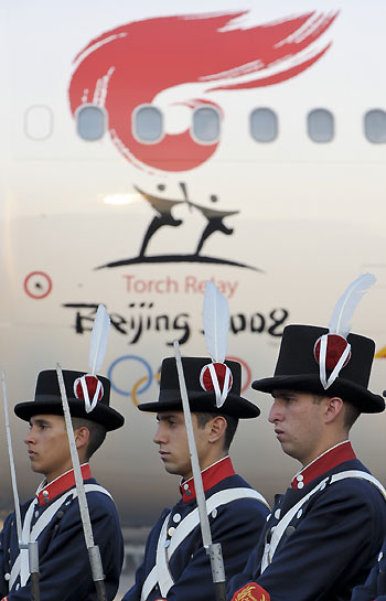 Soldiers in ceremonial dress welcome the Olympic flame at Ezeiza International Airport in Buenos Aires, capital of Argentina, at 17:00 local time (20:00 GMT) April 10, 2008. The Beijing Olympic torch run in Buenos Aires is due to begin on Friday after the San Francisco relay ended smoothly on Thursday despite route changes made to ensure the dignity of the Olympic flame and the safety of torchbearers. [Xinhua] |