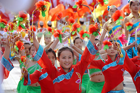 Local performers welcome the Beijing Olympic Torch during its relay in Zhongwei, Ningxia Hui Autonomous Region, June 29, 2008. [Xinhua] |