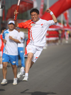 Torchbearer Zhang Wenlei jumps with joy during the Zhongwei leg of the Beijing Olympic Torch relay in Ningxia Hui Autonomous Region, June 29 ,2008. [Xinhua] |