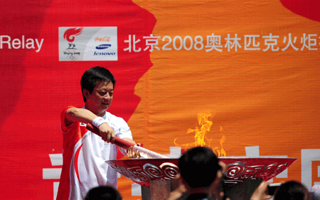 Torch bearer Zhu Jun lights the Olympic caldron during the Lanzhou leg of the Beijing Olympic torch relay in Northwest China's Gansu Province July 7, 2008. [Xinhua]