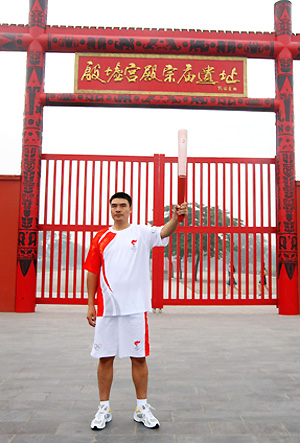Song Zhongbo, chief trainer for the men's canoeing team, holds the Olympic torch in front of Yinxu, the ruins of the last capital of the Shang Dynasty (16th-11th century BC), in Anyang, Henan province. The Anyang leg of the Olympic torch relay kicked off on July 28, 2008. [Xinhua]