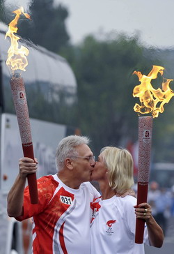 Winfried Vahland was a proud man Wednesday: not only did he get to run a leg of the Olympic torch relay in Beijing, but he was also lucky enough to pass the flame on to his wife Ingrid, an act the pair sealed with a kiss.