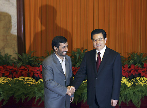 China's President Hu Jintao (R) shakes hands with Iran's President Mahmoud Ahmadinejad at the Great Hall of the People in Beijing September 6, 2008. Ahmadinejad is in China for talks and to attend the opening ceremony of the Beijing 2008 Paralympic Games. [Agencies]