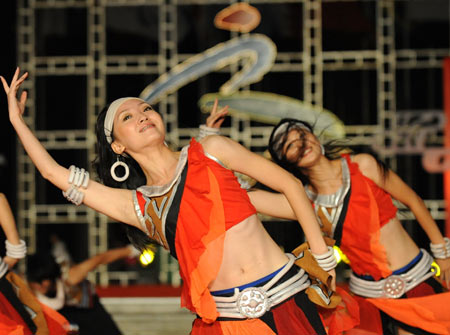 Chinese dancers perform at the flag-raising square at the Beijing Paralympic Village on the Mid-autumn night Sept. 14, 2008. China is celebrating the Mid-Autumn Festival, a traditional Chinese holiday for family reunion and mooncakes, which falls on September 14 this year. [Xinhua]