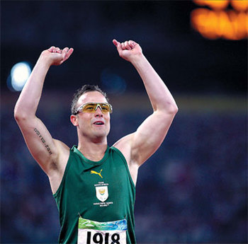 Oscar Pistorius of South Africa celebrates after winning the final of the men's 400 metre T44 classification event at the 2008 Beijing Paralympic Games in Beijing on September 16, 2008.[Agencies]