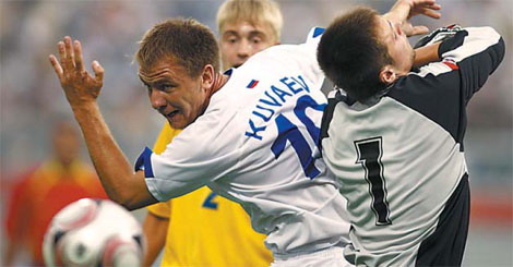 The first goal finally came in the ninth minute of extra time when Ukraine's captain Volodymyr Antonyuk poked a loose ball, that had been blocked by Russian goalkeeper Alexander Lekov, into an empty net.
