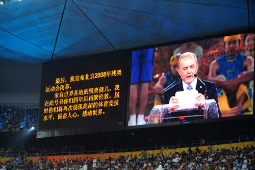 A screen shows International Paralympic Committee (IPC) president Philip Craven as he delievers a speech in the Nationa Stadium at the closing ceremony of the Beijing Paralympic Games, September 17, 2008. [Xinhua]