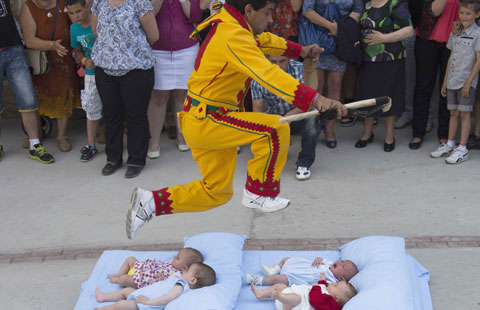 Wei Guirong drives his granddaughters from kindergarten on his home-made three-wheeled vehicle in Luorong county, Liuzhou city of Guangxi Zhuang autonomous region, on May 19.