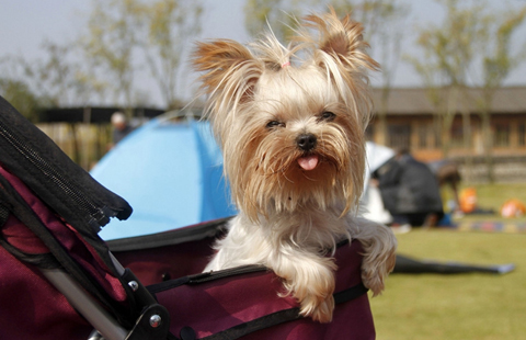 A dog couple in wedding dress get married at a group wedding ceremony in Nanjing, East China's Jiangsu province, on Sunday. A total of 15 pair of dogs were given marriage certificates and exchanged love tokens at the ceremony.
