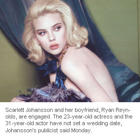 Scarlett Johansson and her boyfriend, Ryan Reynolds, are engaged. The 23-year-old actress and the 31-year-old actor have not set a wedding date, Johansson's publicist said Monday.