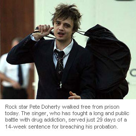 Rock star Pete Doherty walked free from prison today.The singer, who has fought a long and public battle with drug addiction, served just 29 days of a 14-week sentence for breaching his probation.