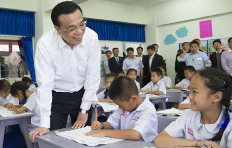 Premier Li Keqiang, left front, arrives at the airport in Bangkok, Thailand, Oct 11, 2013. At the invitation of Thai Prime Minister Yingluck Shinawatra, Li arrived in Bangkok on Oct 11 and started an official visit to the country. [Photo/Xinhua]