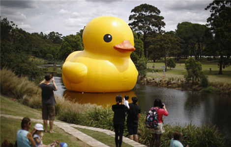 The giant inflatable Rubber Duck installation by Dutch artist Florentijn Hofman floats on the Parramatta River, as part of the 2014 Sydney Festival, in Western Sydney, January 10, 2014. The creation is five stories tall and five stories wide and has been seen floating in various cities around the world since 2007. [Photo/Agencies] |