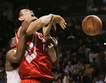 Boston Celtics Al Jefferson (L) fouls Houston Rockets' Yao Ming of
