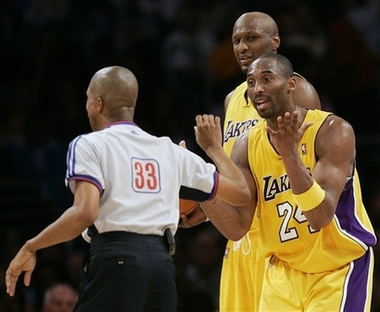 Angeles Lakers' Kobe Bryant, right, complains to an official after being