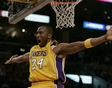 Los Angeles Lakers' Kobe Bryant celebrates a basket against