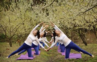 Yoga fans practise yoga on farmland of flowers in Zhangjiajie