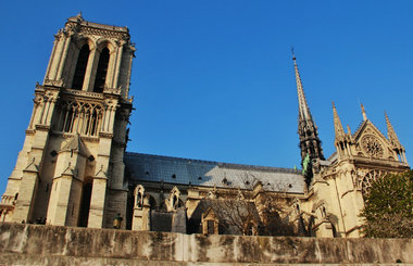 A sperm whale appears to have beached on an embankment in the shadow of Notre Dame Cathedral in Paris.