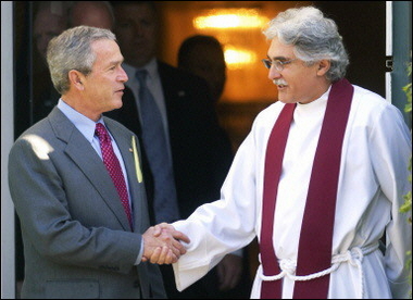 Bush(L) shakes hands with Reverend Luis Leon while departing Saint John's