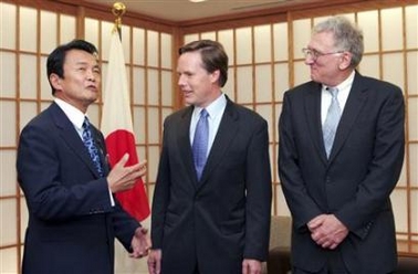 Security Robert Joseph (R) speak with Japanese Foreign Minister Taro Aso