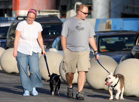 A couple walk their dogs on the street of New York,US, Jan,6,2007.Temperatures in New York have hovered around 10 Celsius degrees this week and soared to 21.7 degrees on Saturday, breaking the previous record high of 17.2 degrees set in 1950.[Xinhua]