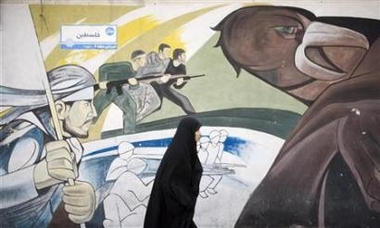 A woman walks past a mural on a wall at Palestine Square in