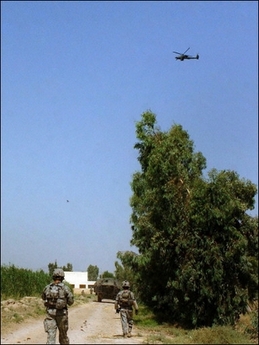An Apache helicopter provides air support over US soldiers patrolling the outskirts of Baquba, north of Baghdad, 23 June. [Agencies]