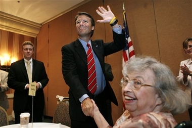 Sen. John Edwards, center, greets Donna Bergheim, 82, during a fundraiser benefiting the 2007 Virginia House of Delegates campaigns in Vienna, Va. on Tuesday, July 31, 2007. [AP]