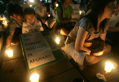 Protesters take part in a candle-light rally demanding negotiations between the US government and the Taliban for the safe return of South Korean hostages in Afghanistan, near the US embassy in Seoul, August 3, 2007. A South Korean delegation arrived on Thursday in the Afghan province where 21 Koreans are held hostage in an attempt to hold direct talks with Taliban kidnappers and peacefully end the two-week ordeal. [Reuters]