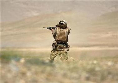A British soldier secures the area near a suicide blast outside Kabul, July 6, 2007. Three British soldiers have been killed in southern Afghanistan in a suspected 'friendly fire' incident, the Ministry of Defence said on Friday. Two other soldiers were injured. [Reuters]