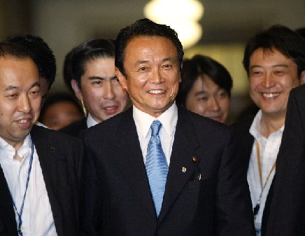 | Japan's ruling Liberal Democratic Party secretary general Taro Aso (C), who is also Foreign Minister, heads to a party meeting at the parliament in Tokyo September 12, 2007, after Japanese Prime Minister Shinzo Abe abruptly announced his resignation. [Reuters] |