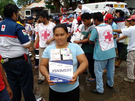 Members of the Mexican Red Cross hand out food parcels in Villahermosa, the capital city of the flooded state of Tabasco, November 4, 2007. Thousands more people were plucked from rooftops in southern Mexico on Sunday even as floods that have left 800,000 people homeless in Tabasco state began to recede, authorities said. The army evacuated 5,000 people in a four-hour operation with 14 helicopters, police official Daniel Montiel said, while trucks brought food and bottled water to some 600 overcrowded shelters struggling to provide enough meals and dry beds. [Agencies]