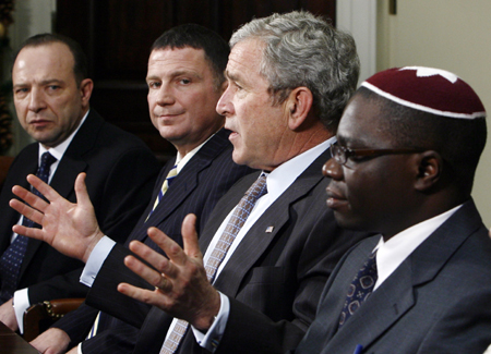 US President George W. Bush meets with Jewish leaders in the Roosevelt Room at the White House in Washington, December 10, 2007. They are (L-R) Dr. Vladimir Kvint, President of the International Academy of Emerging Markets; Yuli Edelstein, Deputy Speaker of the Knesset; Bush; and Rabbi Gershom Sizomu, Abayudaya Jews of Uganda. [Agencies]
