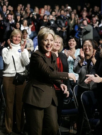 US Democratic presidential hopeful, Sen. Hillary Rodham Clinton (D-NY) greets supporters as she enters a campaign stop at the Austin Convention Center in Austin, Texas, Monday, March 3, 2008. [Agencies]