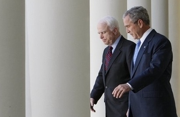 How often to rub shoulders with an incumbent president -- or whether to appear with him at all -- is a delicate matter for presidential wannabes. Al Gore's decision during his 2000 campaign against Bush not to embrace President Clinton was probably a gift to the GOP. Many people think that despite Clinton's personal troubles, Gore should have been standing shoulder to shoulder with Clinton, who had high approval ratings as he left office. "McCain's got to make it very clear that this is not a third Bush term, but a John McCain presidency," said Republican pollster David Winston. "As long as he can make that clear separation, then having a president of the United States on the road, helping with fundraising, going around and talking to people is a very different thing," Winston said. Bush and McCain exhibited solidarity in the Rose Garden on Wednesday when the president embraced the Arizona senator as the party's next standard-bearer. But neither offered anything definitive about what Bush's role would be in McCain's general election campaign. Bush, whose approval ratings skidded to 30 percent in February, stresses that the election had nothing to do with him. "If he (McCain) wants me to show up, I will. If he wants me to say `You know, I'm not for him,' I will," Bush said. "Whatever he wants me to do. I want him to win. ... If he wants my pretty face standing by his side at one of these rallies, I'll be glad to show up." McCain skirted a question about whether Bush would be an asset or albatross on the campaign trail. McCain says he hopes Bush will campaign for him, although he knows the president has a busy schedule. Bush plans to campaign in states where Republicans have tight congressional races but that offer little strategic value to McCain, freeing up the Republican presidential nominee to spend time and money where he needs votes the most. While Bush and McCain dined privately at the White House, the president's top political team and McCain's chief advisers were having their own lunchtime strategy session. The McCain team thanked the White House for not offering running commentary during the primary process. They plan to coordinate the two men's schedules through regular phone calls, although a formal process for meshing Bush's calendar with McCain's has not been set yet. "We'll figure it out," said Ed Gillespie, the president's counselor. "The fact is that even when you've had vice presidents who are running to succeed sitting presidents, they had to feel their way at first — even after working in the same building. But we're all friends, and there is no higher priority for the president than making sure John McCain is elected president." Raising money will clearly be priority No. 1. Even though Bush's approval ratings are low, he remains popular with the party faithful who still pay to get in a room with him. In 2007, Bush raised $66.3 million for the Republican Party and its candidates. Bitter rivals in the 2000 presidential primaries, the two have forged an uneasy relationship during Bush's administration and have clashed on issues such as campaign finance, global warming and defining torture. With all the smiles and back-patting at the White House, it sure looked as if McCain and Bush have long put the bitterness of 2000 aside. Now, it's about how McCain can distinguish himself from Bush -- and do it fast. An hour after Bush and McCain appeared together at the White House, the Democratic National Committee was firing off press releases about how a McCain presidency would look like a third Bush term when it comes to the economy, health care, Social Security and Iraq. White House insiders say the president's low approval rating is a moot point because it's McCain who must win over voters. McCain's name recognition will be helpful. And they contend that Democrats will be wasting millions of dollars if they insist on saying McCain would be a Bush redux. McCain's Democratic rivals each claim to carry a mantle of change, and even Bush admitted he used that line when he ran against Gore in 2000. "Every candidate has got to say `change,'" Bush said. Maybe Bush didn't do McCain any favors, however, when he followed up by saying that McCain is not going to change U.S. policy when it comes to battling terrorism. "He's not going to change when it comes to taking on the enemy," Bush said. |
