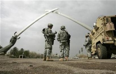 U.S. soldiers stand near the Swords of Qadisiyah monument in Baghdad March 13, 2008. [Agencies
