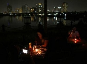 Diners eat by candlelight outdoors at a restaurant participating in the Earth Hour event in Manila March 29, 2008. People switched off lights across the world on Saturday, dimming buildings, hotels, restaurants and bars to show concern at global warming. [Agencies]