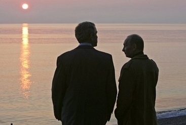 US President George Bush walks with Russian President Vladimir Putin at his summer residence in Sochi, Russia Saturday, April 5, 2008. [Agencies]