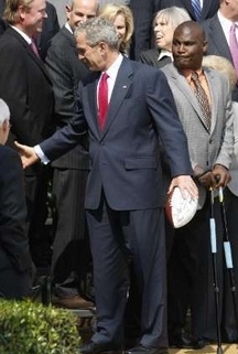 US President George W. Bush shakes hands with members of the New York Giants football team as their "inspirational co-captain", US Army Lt Col Greg Gadson (R) watches during a ceremony honoring the 2008 NFL Superbowl champions on the South Lawn of the White House in Washington April 30, 2008. [Agencies]